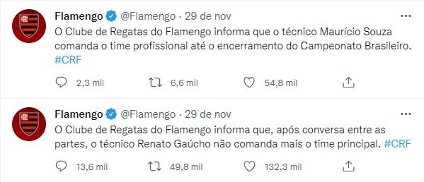 A situação foi escancarada duas semanas depois do fato e tem ligação direta com os fracassos do Flamengo na temporada com a perda do Campeonato Brasileiro e da Copa Libertadores. Com sua demissão, Maurício Souza assumiu o comando interino do rubro-negro, que corre atrás de um novo treinador para 2022 e tem nomes como Jorge Jesus, Marcelo Gallardo, André Villas-Boas e Carlos Carvalhal como favoritos.
