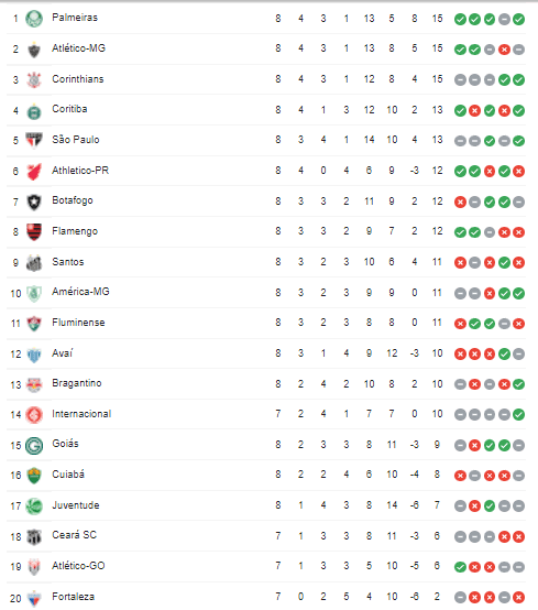 No passado fim-de-semana, foi disputada a 8ª rodada do Campeonato Brasileiro, com finalização nesta segunda-feira (30), em jogo entre Internacional e Atlético Goianiense. O grande destaque da rodada foi o Palmeiras, que ultrapassou o Corinthians e se tornou no novo lider do Brasileirão.