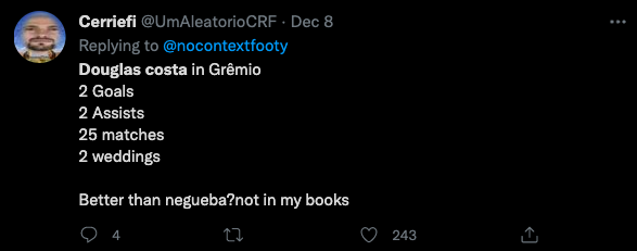 O romance entre Douglas Costa e Grêmio parece não estar dando certo. O jogador não rende dentro de campo e assiste o time caminhar em direção ao rebaixamento sem nada fazer. Para muitos, é a pior contratação do futebol brasileiro no ano. Afinal, custa nada menos do que 800 mil reais por mês aos cofres gremistas, sem contar as cláusulas de produtividade.
