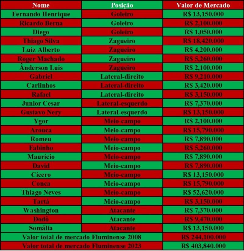A equipe de 2008 do Fluminense contava com jogadores importantes, como Thiago Neves, que era o atleta com maior valor de mercado daquele time, além dele Thiago Silva, também com um alto valor de mercado era outro destaque. Fernando Henrique no gol, Gabriel na lateral-direita, Arouca, Cícero, Conca eram os destaques do meio-campo da equipe tricolor, enquanto Washington fez gols importantes na frente. O valor de mercado do time de 2008 do Fluminense era de R$ 244 milhões e era uma das equipes mais valiosas do Brasil na época. Confira abaixo uma tabela com os valores de cada jogador que estiveram na campanha e ao final compare os valores totais daquela equipe com a dessa temporada: