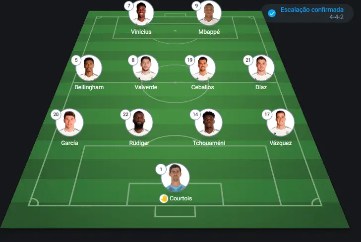 Courtois, Lucas Vázquez, Rüdiger, Tchouaméni e Fran García. Dani Ceballos, Valverde, Brahim Díaz e Bellingham. Mbappé e Vinícius Junior. Os brasileiros Rodrygo e Endrick começam a partida no banco de reservas.
