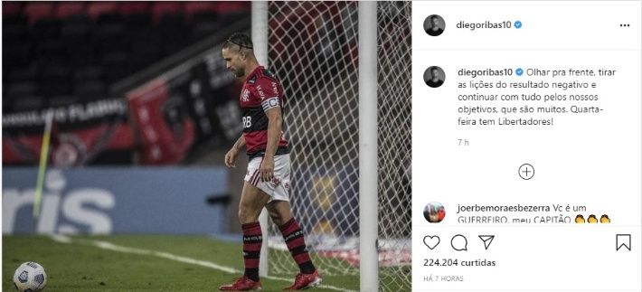 Em sua rede social, Diego Ribas pediu para que o Flamengo tirar lições da maior goleada sofrida como mandante desde 2005 pelo Campeonato Brasileiro, e ainda ressaltou que o foco agora é na Libertadores, a indireta que foi sentida pelo Internacional que enfrentaria o Flamengo se não fosse eliminado pela equipe paraguaia.