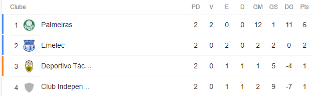 Com 2 vitórias em 2 jogos e 2 goleadas, o Palmeiras vai dominando o Grupo A da competição. Na última partida, o Verdão venceu por 8-1 o Independiente Petrolero e se encontra em boa posição para avançar para a próxima fase.