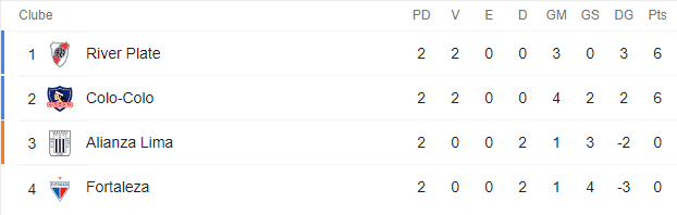 Já no Grupo F, o Fortaleza não tem sido bem sucedido. O time é último classificado, junto com o Allianza Lima, tendo sido derrotado pelo River Plate na última rodada, por 2-0.
