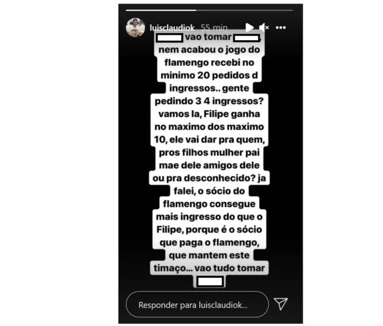 O irmão do lateral esquerdo Filipe Luís, Luís Claudio, teve a paciência testada antes mesmo do fim do jogo dessa quarta-feira (29) em que o Flamengo bateu o Barcelona de Guayaquil pelo segundo jogo da semifinal da Copa Libertadores, com o pedido de diversos torcedores para que Filipe Luís doasse ingressos para a grande final do torneio. Luís não deixou barato e desabafou em sua rede social.