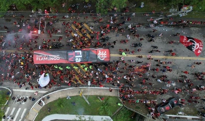 A delegação do Flamengo pegou o ônibus na tarde dessa sexta-feira (19) do Centro de Treinamento para o Aeroporto do Galeão, e foi tomado por uma onda de torcedores do Mengão contagiados para empurrar o time na busca do tricampeonato da Libertadores. Os incentivos, porém, passaram dos limites com torcedores em cima do ônibus com os jogadores e que até conversaram com os atletas pela saída de ventilação no teto.