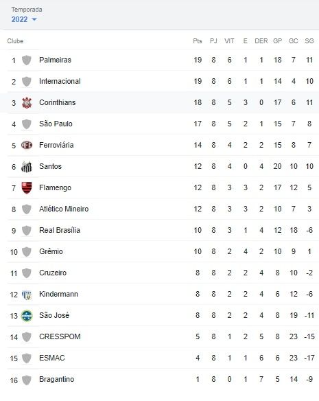 Já o Corinthians perdeu uma grande oportunidade para assumir a liderança. O Timão empatou em casa, contra a Ferroviária, num jogo com 2 gols nos descontos, chegando assim nos 18 pontos e ficando em 3º lugar, a 1 de Palmeiras e Internacional.