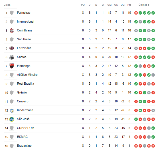 A grande surpresa da 8ª rodada tinha sido a derrota do Verdão para o Internacional, tirando assim a liderança isolada ao time paulista. Agora, o Palmeiras irá defrontar o RB Bragantino, que é último classificado com apenas 1 ponto conquistado.
