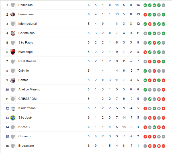 Com ainda muito por se jogar, é o Palmeiras quem lídera a competição, após a vitória no jogo retrasado, disputado no último sábado (16). Desta forma, Internacional e Corinthians podem hoje ultrapassar a Ferroviária caso ganhem seus respetivos jogos.