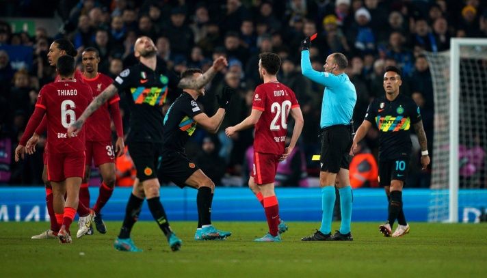 No entanto, a euforia do torcedor da Inter durou pouco. 1 minuto depois do gol, Alexis Sánchez entrou fora de tempo sobre Fabinho e recebeu 2º amarelo. Com 1 elemento a menos, o LIverpool rapidamente recuperou as rédeas do jogo e não se deixou abalar com o gol tomado.