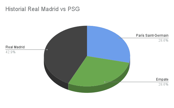 Apesar de um melhor historial dos "merengues" contra o time francês, com 3 vitórias em 7 jogos na Champions League (42,9%) contra duas obtidas pelo PSG PSG (28.6%); se calcularmos apenas os últimos 3 jogos sisputados entre ambos, de 2019 a 2021, encontramos 2 vitórias do PSG, somando assim uma maior vantagem.
