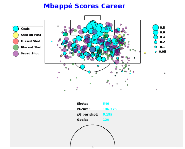 Se observarmos o gráfico, dentro da área não falha, mas fora dela tem gols convertidas em todo o lado do campo adversário.