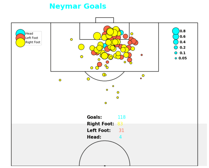 Outra das grandes esperanças do time sai dos pés de Neymar. O craque brasileiro tem qualidade na direita e na esquerda, com uma probabilidade de marcar um gol com qualquer um deles de 80%, sempre que está perto da área.