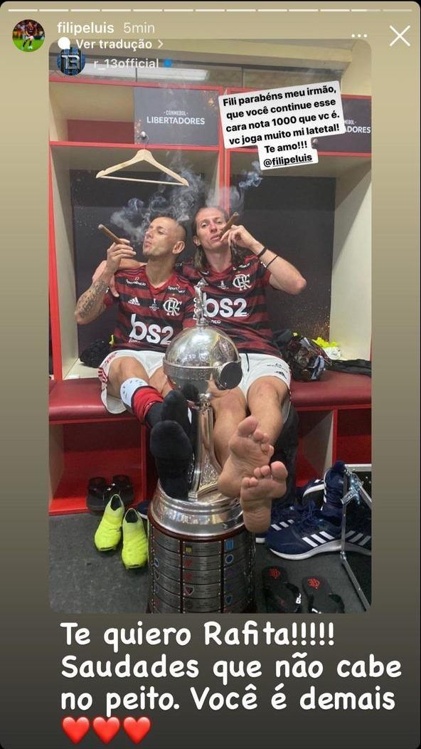 Atualmente no Grêmio, Rafinha não vive bom momento, tanto que virou reserva da equipe que foi eliminada na Copa Sul-Americana 2021, e que está na penúltima colocação do Campeonato Brasileiro 2021 com sete pontos em 12 jogos disputados. As saudades do lateral direito, expostas em forma de parabéns a Filipe Luís, mostram que o vazio do jogador de 35 anos por não ter voltado ao Flamengo em 2021 o incomoda, mas Maurício Isla não quer largar a posição.