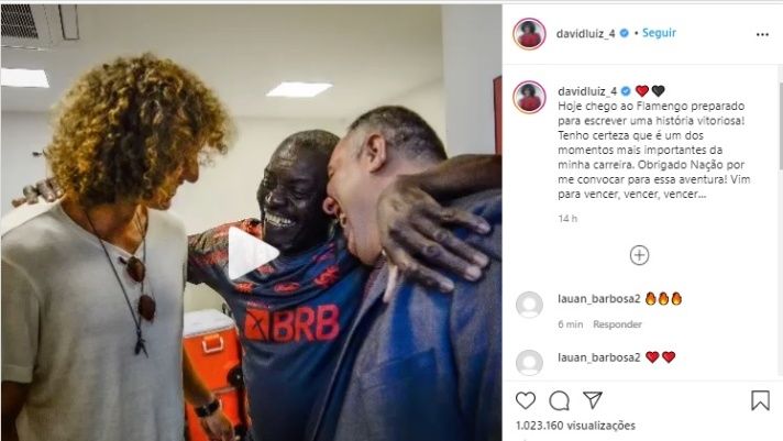 David Luiz já está integrado ao elenco do Flamengo após ser apresentado oficialmente pelo Mengão e já treinar com os novos companheiros nessa segunda-feira (13). Foram 14 anos na Europa até a volta do defensor de 34 anos ao Brasil, dessa vez para o Mengão, já que jogou profissionalmente no país apenas pelo Vitória. E a alegria de David Luiz é tão grande que o jogador se derreteu pelo clube nas redes sociais.