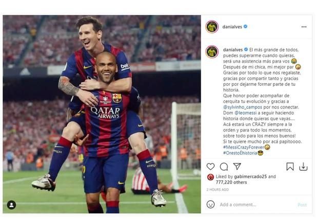 O jogador brasileiro usou sua conta oficial do Instagram para responder ao comentário de Messi junto com uma foto na época em que ambos eram jogadores do FC Barcelona.