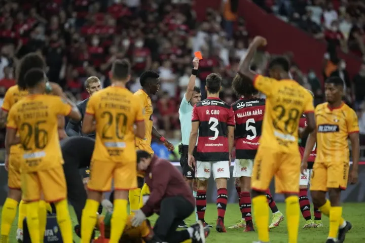 O árbitro Andrés Cunha, que apitou a partida na noite de ontem, inclusive anotou na súmula da partida que Léo Pereira foi expulso por conduta violenta. "Foi expulso o jogador número 4 do Flamengo, Leonardo Pereira, aos 88 minutos por conduta violenta. Com a bola parada e antes de um escanteio, aplica um golpe com seu cotovelo contra o pescoço de um rival. Não estava advertido e acatou a ordem", descreveu o juíz.