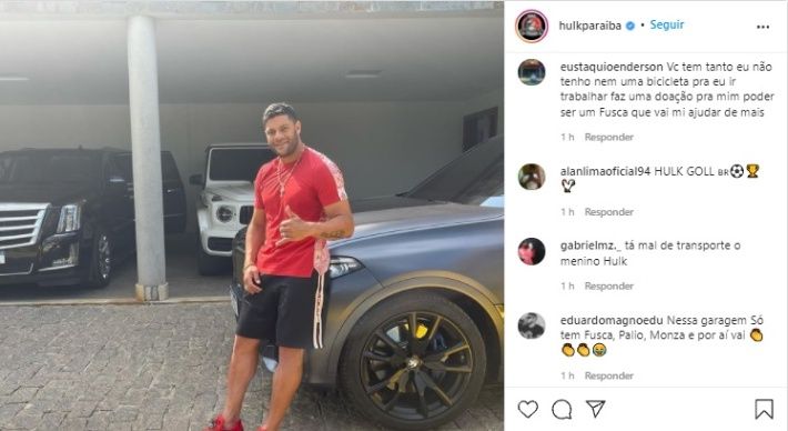 O atacante do Atlético-MG postou em suas redes sociais uma foto em que aparece com três veículos de luxo, como se fosse Cristiano Ronaldo em sua garagem. Os veículos são um Cadillac Escalade, uma Mercedes G63 e uma BMW X7. Os três meios de transporte de Hulk custam somados aproximadamente R$ 3 milhões, quase três salários do camisa 7 do Galo.