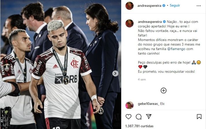 O lateral direito do Flamengo Matheuzinho, de 21 anos, deu entrevista ao “GE” e revelou que conhece Andreas Pereira, de 25 anos, desde 2016, na cidade de Londrina, no interior do Paraná. Mas após a falha crucial que deixou o título da Libertadores com o Palmeiras, o jovem atleta afirmou que Andreas ficou muito abalado e, nos jogos seguintes, quis mostrar todo o apoio ao amigo.