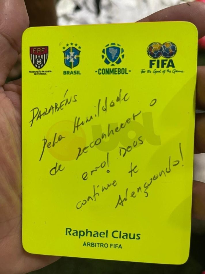 Hulk tomou um cartão amarelo após o jogo e no vestiário, mas na verdade em tom de agradecimento e homenagem de Raphael Claus. O árbitro escreveu no cartão amarelo que ficou feliz por Hulk ter reconhecido o erro, algo que deixou o atleta emocionado e feliz de ter sofrido esse cartão amarelo com o melhor clima possível.