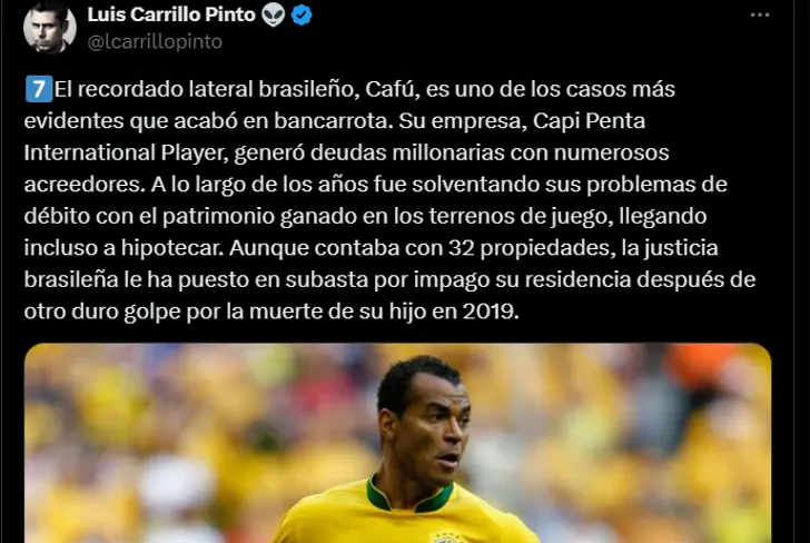 “O lembrado lateral brasileiro Cafú é um dos casos mais óbvios que terminaram em falência. Sua empresa, a Capi Penta International Player, gerou dívidas milionárias com diversos credores. bens conquistados nos campos de jogo, chegando até a hipotecar Embora tivesse 32 imóveis, a justiça brasileira colocou sua residência em leilão por falta de pagamento após mais um duro golpe pela morte de seu filho em 2019. "; foi a informação compartilhada pelo renomado comunicador peruano Luis Carrillo Pinto.