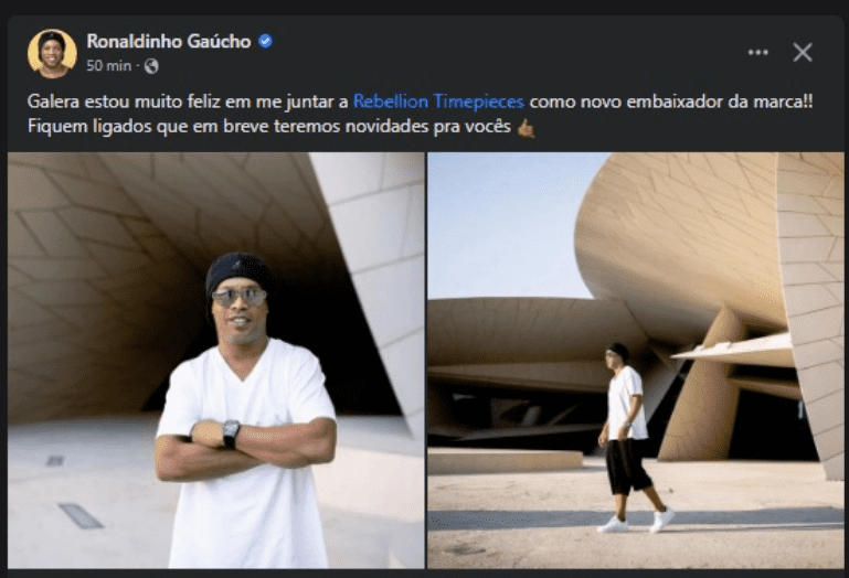 Recentemente, a nova empreitada do "Bruxo" foi divulgada: ele virou embaixador da Rebellion Timepieces, que tem uma equipe própria no WEC (World Endurance Championship), já venceu as 24h de Le Mans e patrocina a equipe Alfa Romeo de Fórmula 1. A Rebellion é uma marca suíça de relógios, bastante conceituada no continente europeu e também mundo afora. O ex-jogador fez postagens nas redes sociais para anunciar o novo acerto.