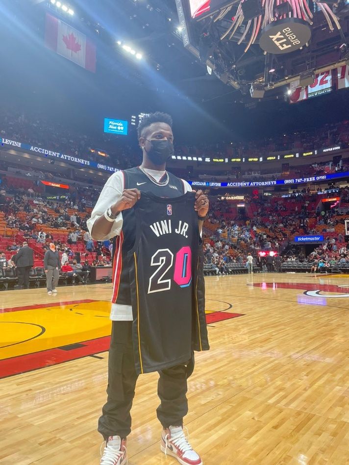 O craque do Real Madrid assistiu a um jogo do Miami Heat, de seu amigo Jimmy Butler, na FTX Arena, e ainda foi homenageado pela franquia no intervalo da partida diante do Detroit Pistons. O atacante da seleção brasileira ganhou uma camisa do Miami Heat com o número 20, o mesmo que usa na Espanha, no presente de Natal antecipado.