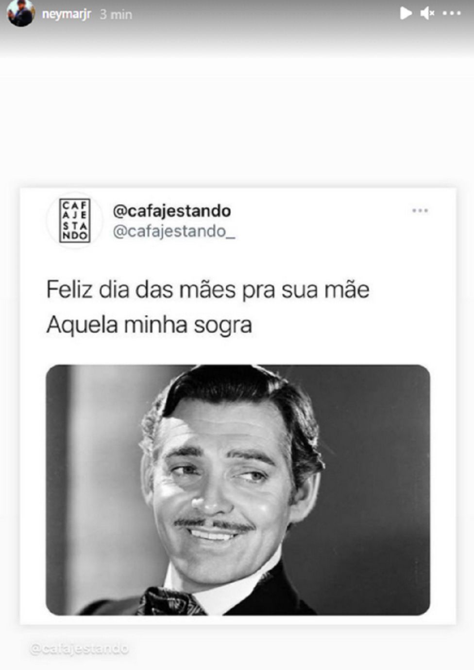 O craque brasileiro publicou uma imagem em sua reportagem no Instagram, aproveitando a data marcada para cumprimentar todas as mães das mulheres com quem se relaciona. O meme explicava: "Feliz Dia das Mães para suas mães, minhas sogras."