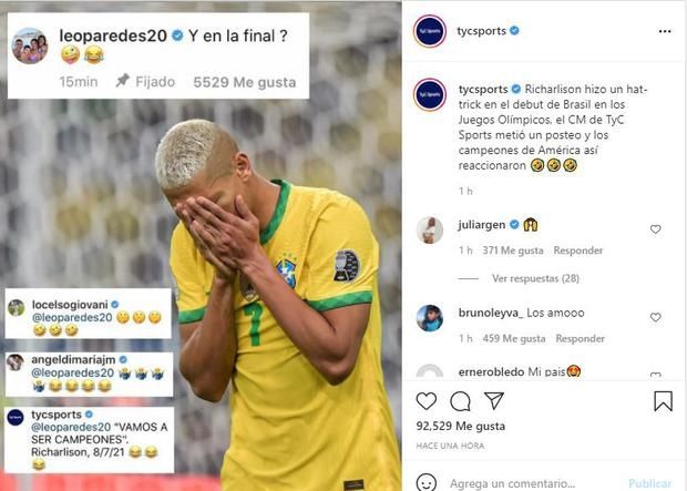 A notícia dos gols de Richarlison foi postada no Instagram do canal argentino TyC Sports, e nos comentários os jogadores argentinos Leandro Paredes, Ángel Di María e Giovani Lo Celso zombaram do que o atacante brasileiro havia feito, lembrando a final da Copa América. “E na final?”, Escreveu Paredes, enquanto os seus companheiros só colocam emojis de cara são risos. A conta do canal também foi agregada com a fase: “Vamos ser campeões. Richarlison, 7/8/2021 ″.