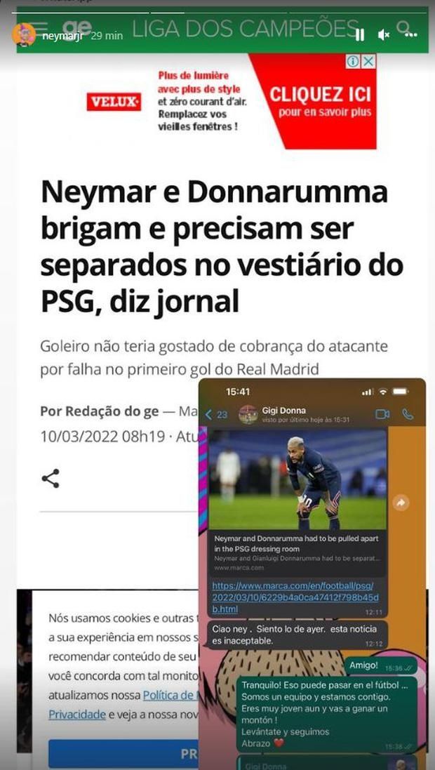 "Olá, Ney. Desculpe por ontem. Esta notícia é inaceitável", escreveu Donnarumma ao seu parceiro em um diálogo via WhatsApp. "Quieto. Isso pode acontecer no futebol. Somos uma equipe e estamos com você. Você ainda é muito jovem e vai ganhar muito. Levante-se e vamos continuar. Abraço”, apoiou o artilheiro do ‘Canarinha’.