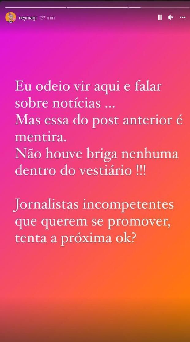 Neymar se concentrou nas publicações da imprensa. “Detesto vir aqui falar de novidades... mas esse post anterior é mentira. Não houve briga dentro do vestiário. Jornalistas incompetentes que querem se promover, confiram o próximo", disse o '10' do Paris Saint Germain.