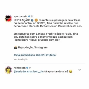 “Tá aprontando aí, né?”, escreveu Richarlison, marcando o perfil de um dos seus sósias. A publicação comentada pelo jogador foi feita pelo portal "SportBuzz". Ao que tudo indica, Tina realmente ficou com o sósia de Richarlison acreditanto que fosse o jogador da Seleção Brasileira.