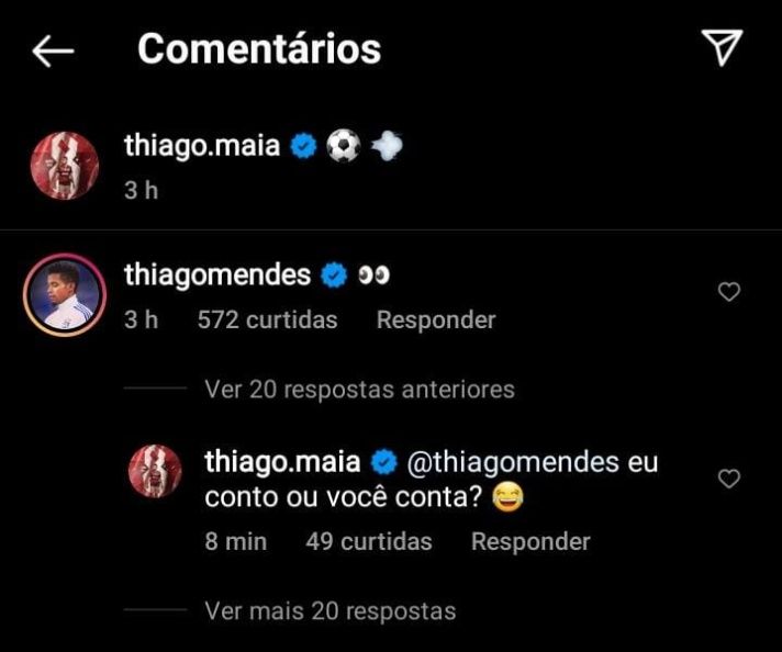 E tudo se tornou público após uma troca de comentários e emojis nas redes sociais entre os dois “Thiagos”, tanto Thiago Maia, quanto Thiago Mendes, parecem falar a mesma língua, já que entre 2017 e 2019 a dupla de volantes atuou pelo Lille, da França. Atualmente a transferência para o Flamengo seria possível apenas por empréstimo, já que o valor de mercado de Thiago Mendes seria de R$ 88,4 milhões.