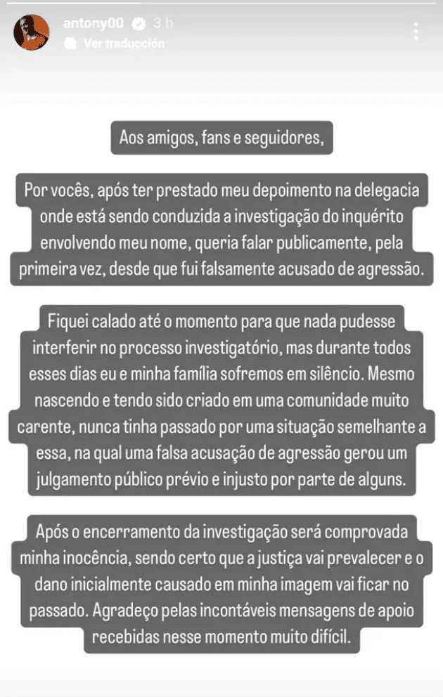O famoso jogador de futebol Antony, que joga pela seleção brasileira e pelo Manchester United, emitiu um comunicado em resposta às acusações de violência de gênero levantadas por seu ex-companheiro, defendendo sua inocência.