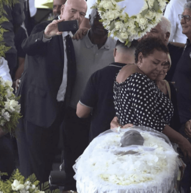 Durante o velório do maior jogador de todos os tempos, o presidente da FIFA, Gianni Infantino, deu uma baita "bola fora". Ele fez uma selfie ao lado de grandes ídolos do Peixe e amigos do Rei do Futebol, como Lima, Manoel Maria e outros. Porém, a imagem apareceu com o caixão aberto, mostrando o corpo de Pelé, o que gerou uma repercussão negativa.