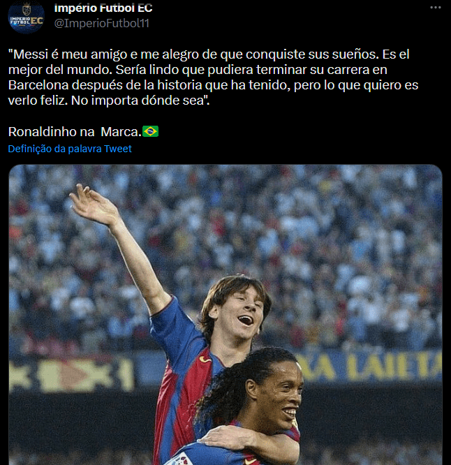 Em palavras para a Eleven Sports TV, Ronaldinho se esquivou um pouco da pergunta: "Se Messi é o melhor de todos? É difícil". Dinho explicou assim: "É difícil, porque são tantos jogadores. Não gosto de comparar. Tem Pelé, Maradona... Cada um foi o melhor na sua época." Em outro momento, ele também garantiu que o argentino não era o melhor da história: "Não posso dizer que Messi é o melhor da história, mas é o melhor de sua época".