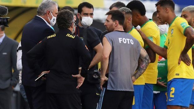 "Faz três dias que estamos aqui. Esperaram começar a partida. Por que não avisaram antes? Por que não foram ao hotel? O mundo está vendo tudo isso", falou Messi ao conversar com o jogadores brasileiros. A partida foi suspensa após agentes da Anvisa pedirem a deportação de quatro jogadores da Argentina porque eles descumpriram regras de quarentena de viajantes que saem do Reino Unido para o Brasil.