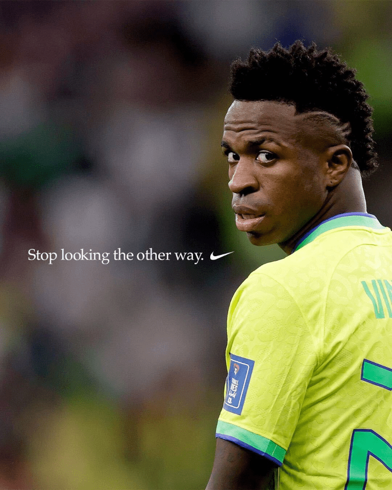 Há algum tempo, o atacante brasileiro chegou a rescindir o contrato com a Nike. Porém, o caso recente de racismo contra ele serviu para “reaproximar” ambas as partes. No dia 23 de maio, a norte-americana divulgou uma peça de campanha com a foto de Vini Jr, com a frase “Pare de olhar para o outro lado”, além de “Estamos com você, Vini!”.