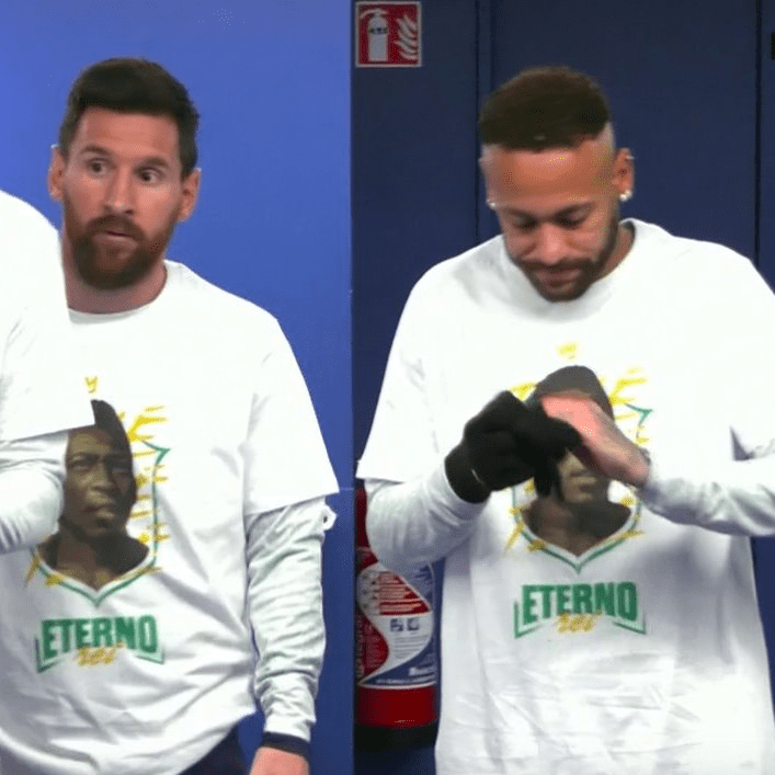 Antes de um jogo do PSG, a dupla Neymar e Messi preparou uma homenagem a Pelé. O Rei do Futebol, que morreu no último dia 29/12, foi homenageado em uma camisa com seu rosto e a imagem: "O Eterno Rei". A imagem foi registrada no vestiário do Parc des Princes, antes de um jogo do time francês.