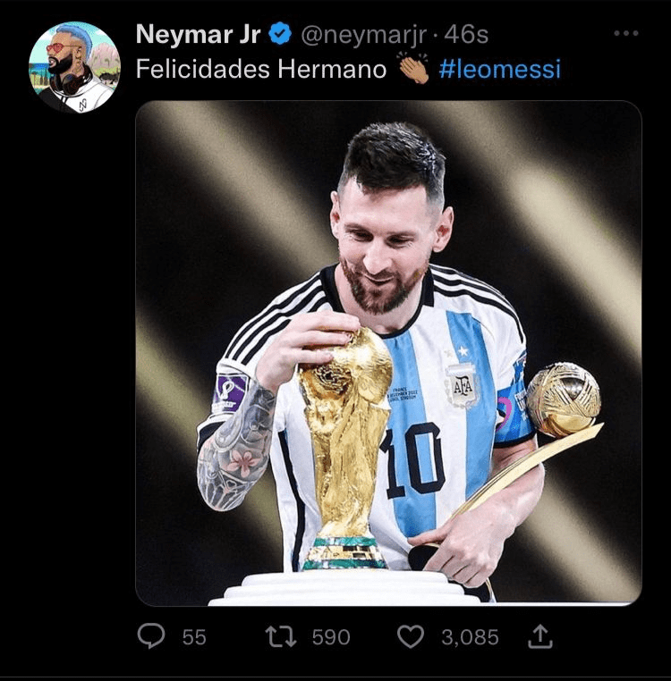 Melhor amigo do argentino desde os tempos do Barcelona, Neymar foi o primeiro a lhe dar os parabéns pela conquista do título mundial. Eliminado nas quartas de final com a Seleção Brasileira após derrota nos pênaltis para a Croácia, o camisa 10 do Paris Saint-Germain tratou de dar os cumprimentos pela histórica conquista. Com a seleção principal, o ex-santista conquistou a Copa das Confederações de 2013, com uma vitória maiúscula por 3 a 0 diante da Espanha, onde marcou o segundo gol.