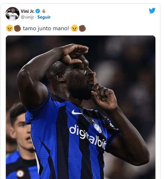 As reações à mensagem do ex-atacante do Everton, United e Chelsea não foram revogadas. Mbappé, Reece James, Courtois, Youri Tielemans... e destaca-se o recado de Vinícius Jr., que tem demonstrado total apoio a Lukaku, através de sua conta no Twitter: