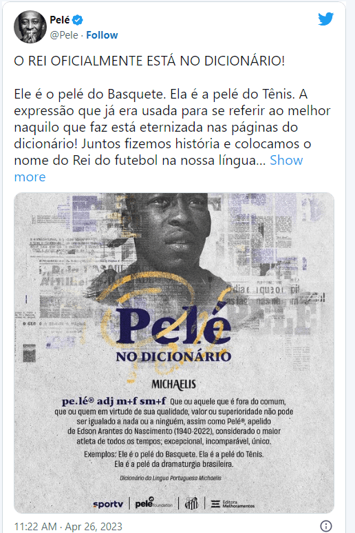 “Pelé (adjetivo): Dito de alguém que é excepcional, incomparável, único por sua qualidade, seu valor ou sua superioridade, e que não pode ser comparado a nada nem a ninguém, como Pelé, apelido de Edson Arantes do Nascimento (1940 -2022), considerado o maior atleta de todos os tempos. Exemplos: Ele é o Pelé do basquete, ela é o Pelé do tênis, ela é o Pelé do teatro brasileiro, ele é o Pelé da medicina”. A partir de agora, podemos usar o nome do craque brasileiro como adjetivo oficializado.