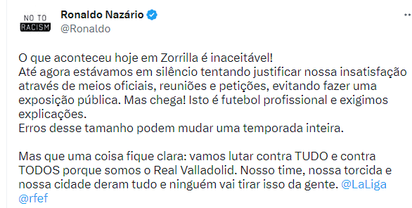 "Erros dessas dimensões podem mudar uma temporada inteira, mas que fique claro uma coisa: vamos lutar contra TUDO e TODOS porque somos o Real Valladolid. Nosso time, nossos torcedores e nossa cidade deram tudo e ninguém vai tirar. de nós" 'O Fenômeno', dono do Valladolid, finalizou. Uma raiva monumental por uma decisão de arbitragem complexa, que desmoralizou a equipe do Valladolid à beira do intervalo e poderia ter custado a derrota subsequente.