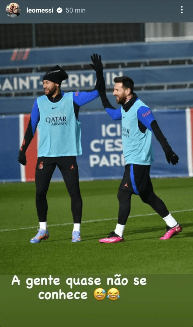 "A gente quase não se conhece", diz a primeira publicação publicada pelo craque da Seleção Brasileira e depois repostada duas vezes por Messi em seu próprio perfil. O argentino repostou a mesma mensagem, só que em português, acompanhada de uma série de emojis que mostram a ironia do post e o ótimo relacionamento entre os dois que vem da convivência na época do Barcelona.