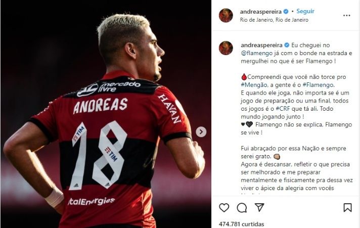 Andreas Pereira chegou ao Flamengo em agosto de 2021 e pelo clube fez 24 jogos com cinco gols marcados e uma assistência, além de cinco cartões amarelos, segundo o site “Transfermarkt”. O meia ficou marcado pela falha no gol do título da Libertadores do Palmeiras, marcado por Deyverson.