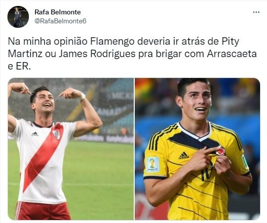 O pedido foi levantado por torcedores do Flamengo nas redes sociais e os números dos jogadores são bons, mas não a fase recente. Gonzalo “Pity” Martínez, de 28 anos, tem no Al-Nassr, da Arábia Saudita, 29 jogos com cinco gols e oito assistências desde setembro de 2020. Já James Rodríguez, de 30 anos, soma no Al-Rayyan, do Catar, quatro jogos, um gol e uma assistência desde setembro de 2021, segundo o site “oGol”.