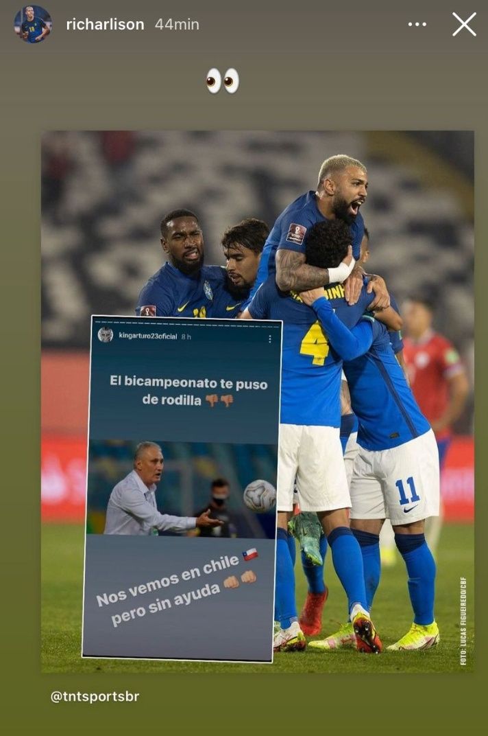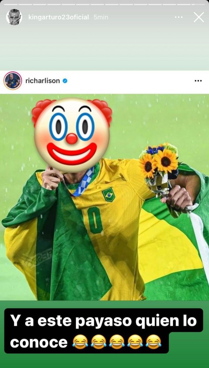 Richarlison repostou a provocação que Arturo Vidal fez após a eliminação do Chile em julho, e logo o experiente meia respondeu o “Pombo” nas redes sociais com a foto do atacante do Everton, da Inglaterra, com uma cara de palhaço em seu rosto e a pergunta sobre quem é o jogador que ousa provocá-lo. Fato é que o Brasil venceu os dois duelos e está mais perto da Copa do Mundo de 2022.