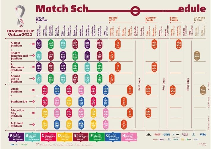 O início da Copa do Mundo está marcado para 21 de novembro, com a grande final a ser agendada para 18 de dezembro, cerca de 1 mês de competição. Os horários da Fase de Grupos estão marcados para as 7h, 10h, 13h e 16h de Brasília. As oitavas e as quartas serão disputadas às 12h e 16h, com a decisão do 3º lugar e a final a serem jogados às 12h.
