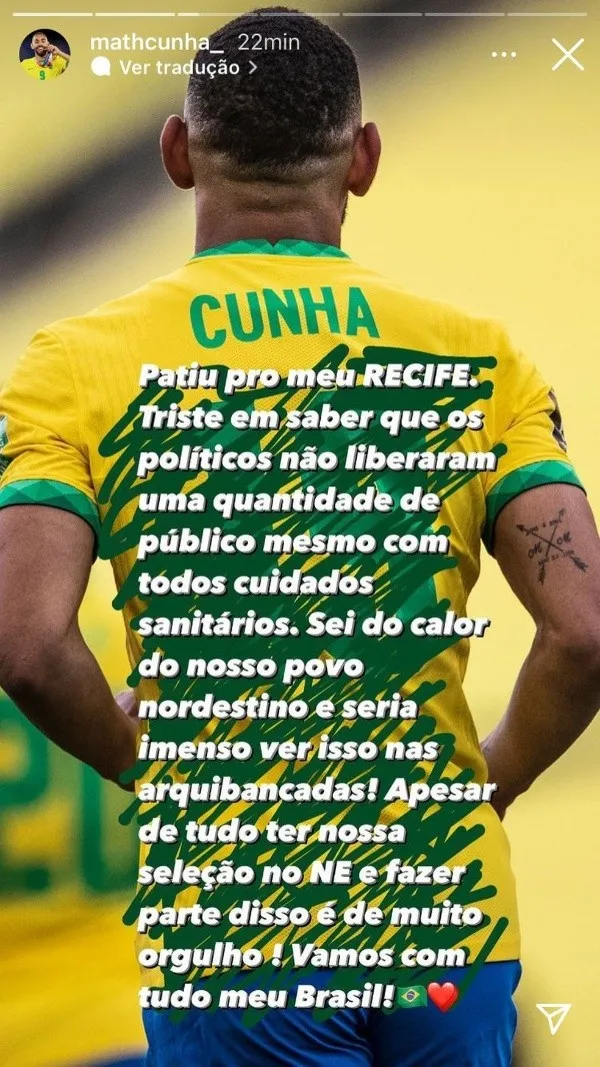 O atacante de 22 anos afirmou estar orgulhoso por ser do nordeste do país e poder defender seu país em sua região, mas está profundamente decepcionado pelos políticos não terem liberado a presença de público no Brasil, apesar da crise sanitária no país. Matheus Cunha está no Atlético de Madrid, da Espanha, e busca seu primeiro gol pela Seleção Brasileira.