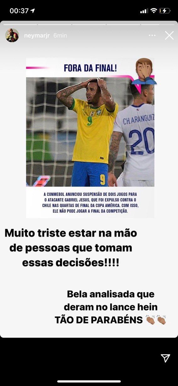 O craque da Seleção Brasileira perdeu o controle nas redes sociais e repudiou a punição para Gabriel Jesus que, para Neymar, foi tomada de maneira injusta e sem nenhum critério, e deixou a entender que querem decidir a final fora de campo ao prejudicarem o Brasil que perde o titular de vez e a briga pelo substituto perfeito é grande com Roberto Firmino, Everto Cebolinha, Gabriel Barbosa e Vinícius Júnior.